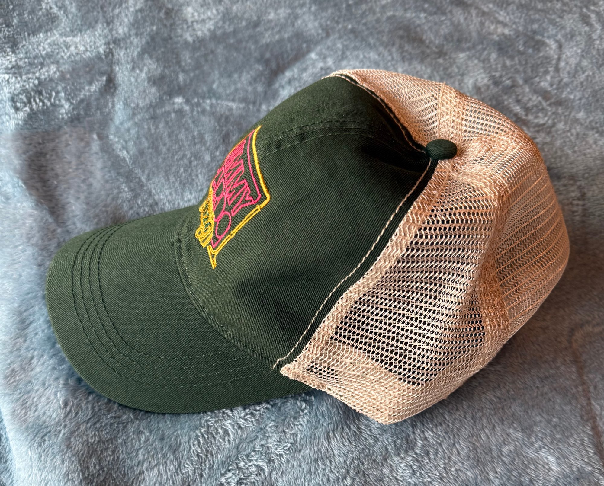 Green & beige hat with red & mustard stitching